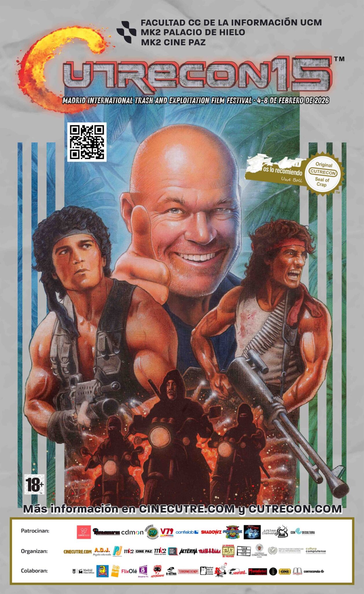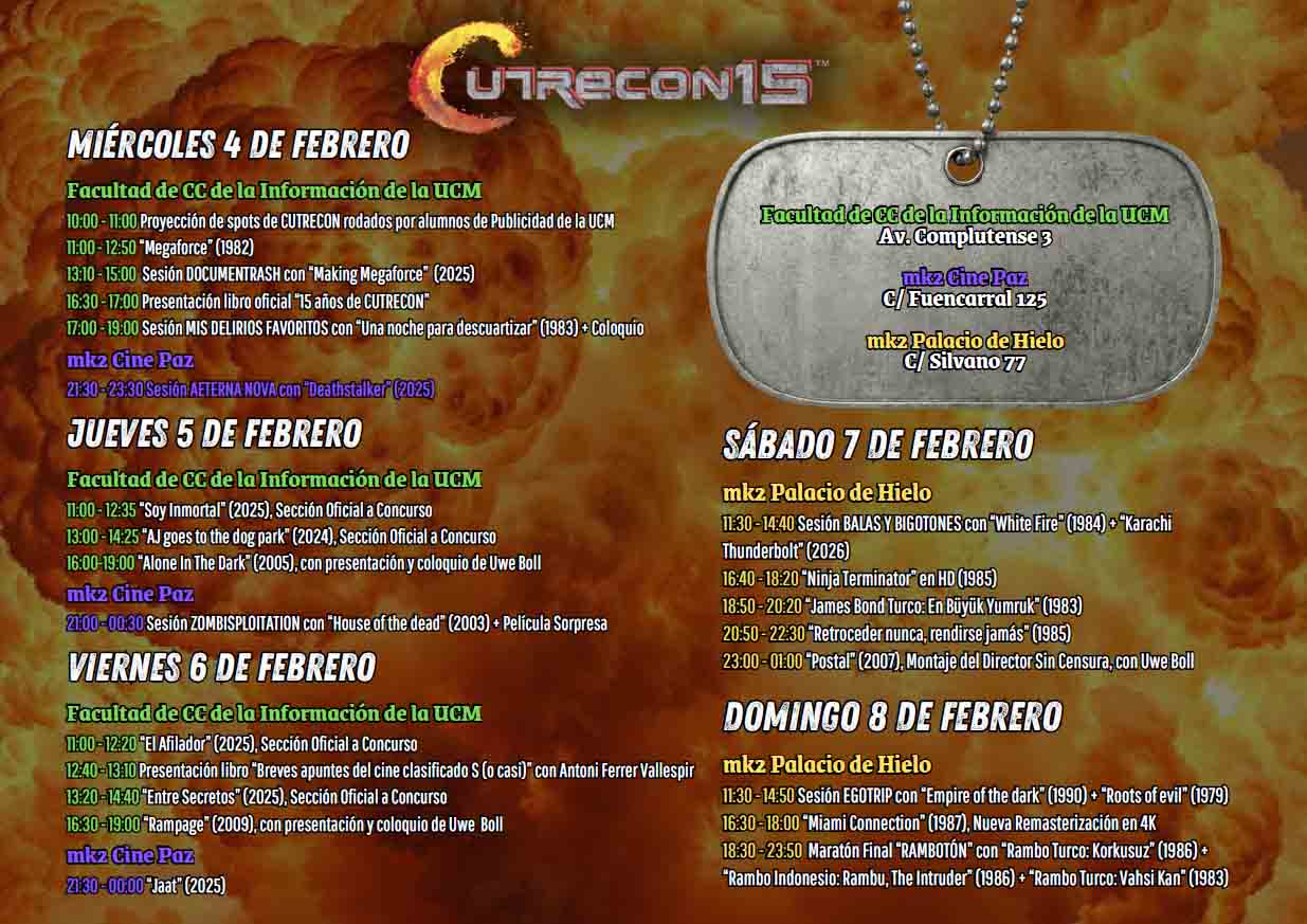 El Festival Internacional de Cine Trash de Madrid, CutreCon, regresa a Madrid del 4 al 8 de febrero en su decimoquinta edición. Con más de 20 títulos repartidos a lo largo de sus cinco jornadas, divididas en tres sedes. La temática de este año es el peor cine de acción y, en palabras de la organización, “las cosas que explotan”.