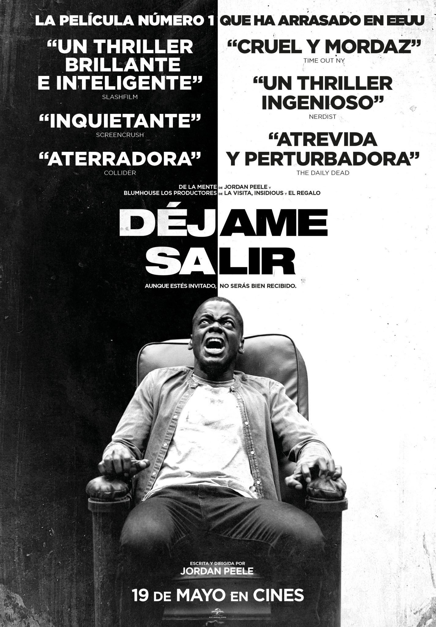 Estreno en España: 19 de mayo. Título original: Get out. Duración: 103 min. País: EE.UU. Dirección: Jordan Peele. Guión: Jordan Peele. Música: Michael Abels. Fotografía: Toby Oliver. Reparto principal: Daniel Kaluuya, Bradley Whitford, Allison Williams, Catherine Keener, Betty Gabriel,Caleb Landry Jones, Lyle Brocato, Ashley LeConte Campbell, Marcus Henderson, LilRel Howery, Gary Wayne Loper, Jeronimo Spinx, Rutherford Cravens. Producción: Blumhouse Productions, QC Entertainment. Distribución: Universal Pictures. Género: thriller, terror. Web oficial: http://www.dejamesalir.com/