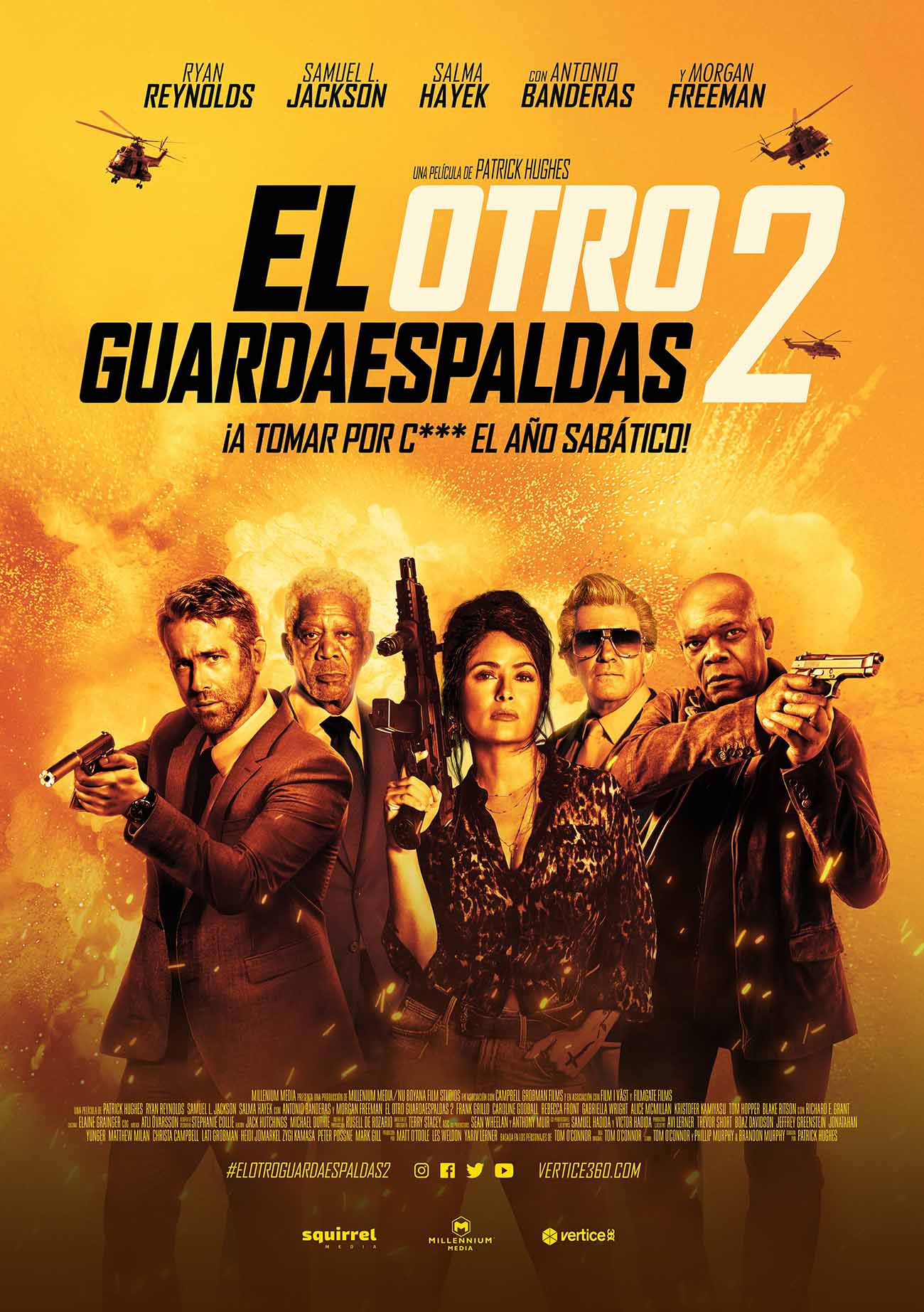 Estreno en España: 16 de junio de 2021. Título original: Hitman’s Wife’s Bodyguard. Duración: 114 min. País: EE.UU. Dirección: Patrick Hughes. Guion: Tom O’Connor, Brandon Murphy, Phillip Murphy. Música: Atli Örvarsson. Fotografía: Terry Stacey. Reparto principal: Ryan Reynolds, Samuel L. Jackson, Salma Hayek, Antonio Banderas, Morgan Freeman, Frank Grillo, Tom Hopper, Richard E. Grant. Producción: Millennium Media, Summit Entertainment, Above the line set assistance & security, Campbell Grobman Films. Distribución: Vértice Cine. Género: acción, comedia. Web oficial:https://www.lionsgatepublicity.com/theatrical/the-hitmans-wifes-bodyguard
