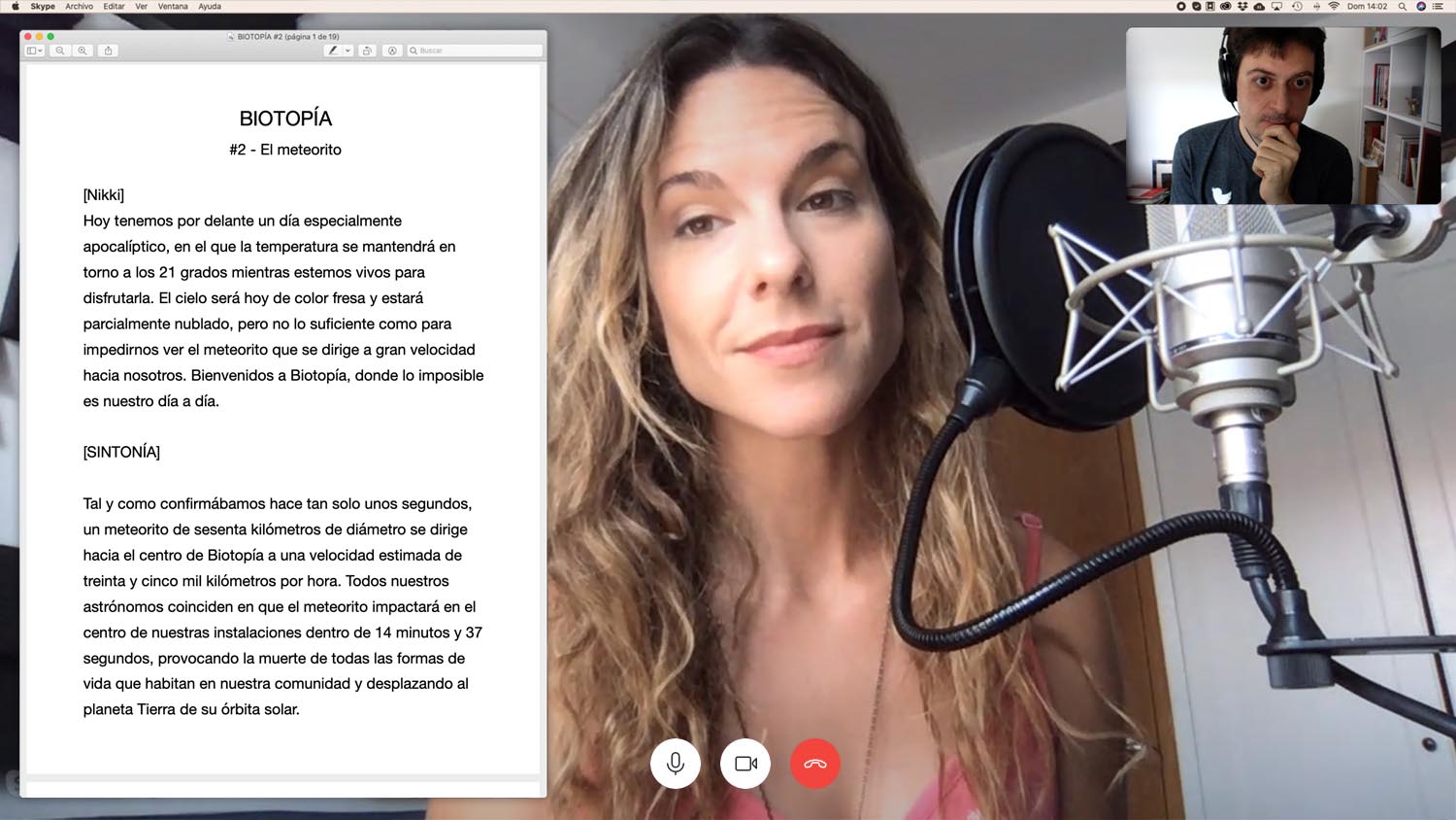 ‘Biotopía’ cuenta también con la participación de actores y actrices como Ingrid García-Jonsson, Valeria Ros, David Pareja, Lorena Iglesias, Claudio Serrano, Olga Aguirre o Julián Génisson. “El formato de falso boletín informativo nos permite que cada actor se grabe utilizando cualquier micro que tenga a mano o incluso su propio teléfono, ya que luego les escuchamos como si estuvieran llamando al boletín de ‘Biotopía’, comenta Bartual. A Ingrid García-Jonsson, que interpreta a Elena, una profesora de ciencias robóticas, le alegra formar parte de ‘Biotopía’ porque “además de volver a trabajar con Manuel Bartual, con quien ya trabajé en su película ‘Todos tus secretos’, es el proyecto más fácil y cómodo en el que he participado nunca. Grabamos todo vía videollamada y sin movernos de casa”. Junto a García-Jonsson y el resto de actores, en ‘Biotopía’ participa también gente como Javi Rojo, realizador audiovisual con quien Bartual coincidió en un proyecto anterior y que en el podcast interpreta a Germán, el jefe de seguridad de ‘Biotopía’. “Conocí a Javi trabajando en #ElGranSecuestro, un reality que desarrollé junto a Modesto García para Playz de RTVE. Javi tiene dos cualidades que lo hacían imprescindible en ‘Biotopía’: la misma pasión por la ciencia ficción que tengo yo, y una voz poderosa”. Entre el reparto se encuentran también amistades y hasta familiares, como Paula Bourdette. “Es mi suegra”, dice Bartual. “Y no le ha hecho falta ser actriz para hacerlo fenomenal”.