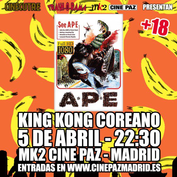 Las entradas para la proyección en Alta Definición de ‘A.P.E.’ (1976), también conocida como “King Kong Coreano”, el viernes 5 de abril a las 22:30 horas en el mk2 Cine Paz (C/ Fuencarral, 125) de Madrid, ya están a la venta en www.cinepazmadrid.es.