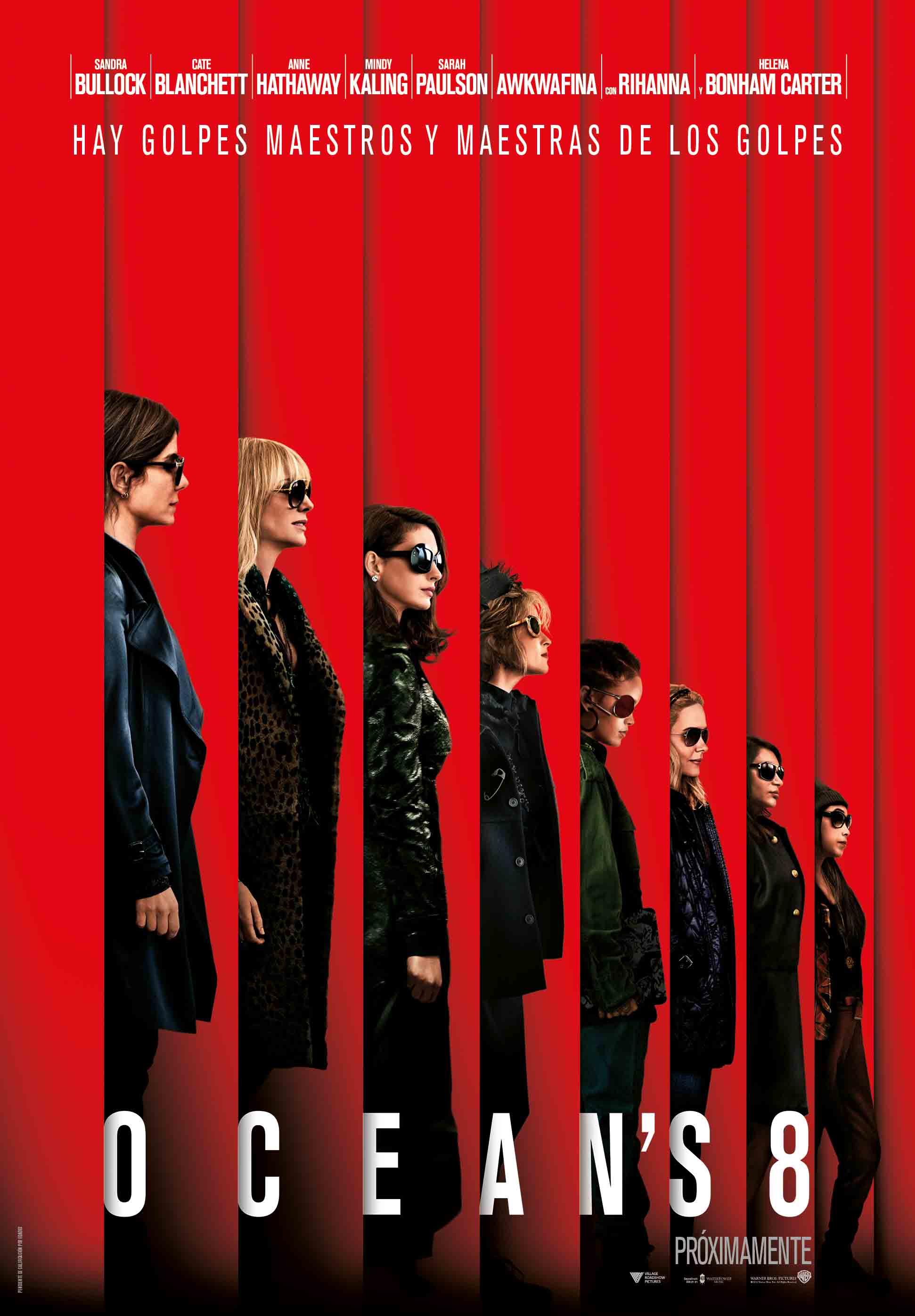 Estreno en España: 6 de julio. Título original: Ocean’s Eight. Duración: 110 min. País: EE.UU. Dirección: Gary Ross. Guion: Olivia Milch, Gary Ross. Música: Daniel Pemberton. Fotografía: Eigil Byld. Reparto principal: Sandra Bullock, Cate Blanchet, Anne Hathaway, Mindy Kaling, Sara Paulson, Awkwafina, Rihana, Helena Boham Carter, Richard Armitage, Elliot Gould, James Corden, Dakota Faning, Shaobo Qin, Olivia Munn, Kim Kardashian, Katie Holmes. Producción: Warner Bros. Pictures, Village Roadshow Pictures, Smoke House Pictures. Distribución: Warner Bros. Pictures. Género: comedia, acción. Web oficial: http://www.warnerbros.es/oceans-8