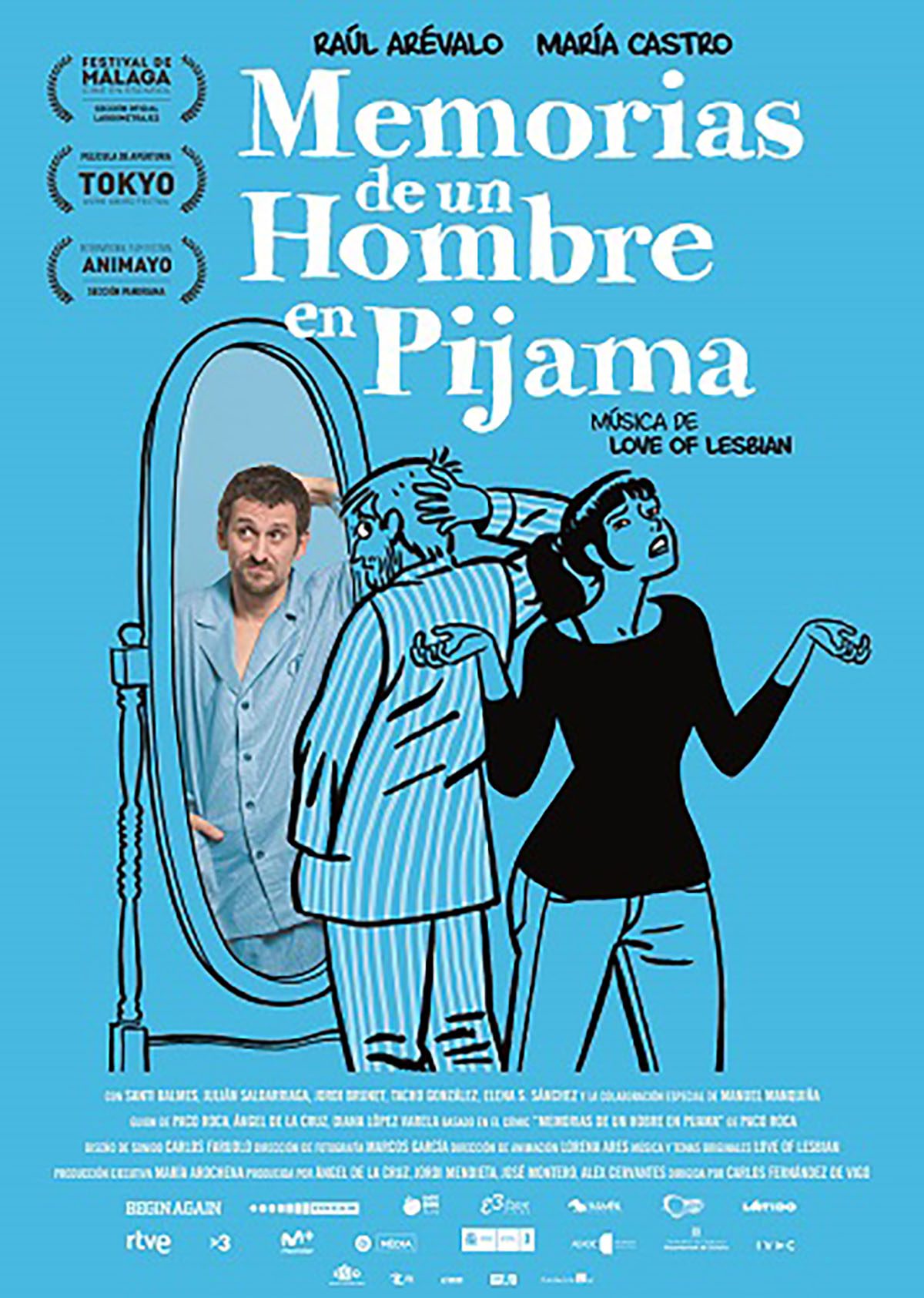 Estreno en España: 4 de enero de 2019. Título original: Memorias de un hombre en pijama. Duración: 75 min. País: España. Dirección: Carlos Fernández de Vigo. Guion: Ángel de la Cruz, Paco Roca, Diana López Varela. Música: Love of lesbian. Fotografía: Carlos García Cabeza. Reparto principal: Raúl Arévalo, María Castro, Manuel Manquiña. Producción: Dream Team Concept, Ladybug Films, Movistar+, Televisión de Galicia (TVG), Televisión Española (TVE). Distribución: Begin Again. Género: comedia, animación, cómic, adaptación. Web oficial: https://twitter.com/UnHombrenPijama