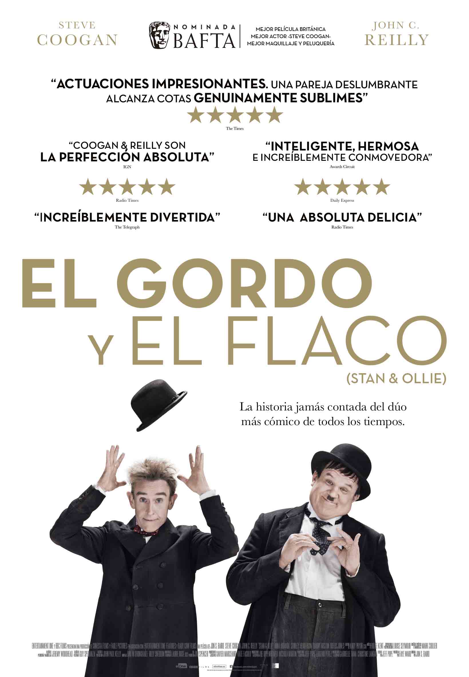 Estreno en España: 15 de marzo de 2019. Título original: Stan & Ollie. Duración: 98 min. País: Reino Unido. Dirección: Jon S. Baird. Guion: Jeff Pope. Música: Rolfe Kent. Fotografía: Laurie Rose. Reparto principal: Steve Coogan, John C. Reilly, Shirley Henderson, Danny Huston, Nina Arianda. Producción: BBC, eOne Films, Sonesta Films, Fable Pictures. Distribución: eOne Films. Género: biográfica, comedia, drama. Web oficial: https://stanandollie.co.uk/
