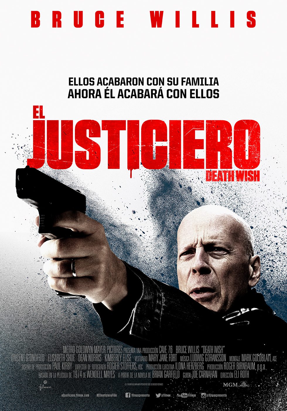 Estreno en España: 29 de marzo de 2019. Título original: Death Wish. Duración: 107 min. País: EE.UU. Dirección: Eli Roth. Guion: Joe Carnahan. Música: Ludwig Göransson. Fotografía: Rogier Stoffers. Reparto principal: Bruce Willis, Elisabeth Shue, Camila Morrone, Vicent D’Onofrio, Kimberly Elise, Dean Norris. Producción: Metro Goldwyn Mayer, Cave 76. Distribución: Filmax. Género: drama, acción, adaptación, remake. Web oficial: https://www.deathwish.movie/