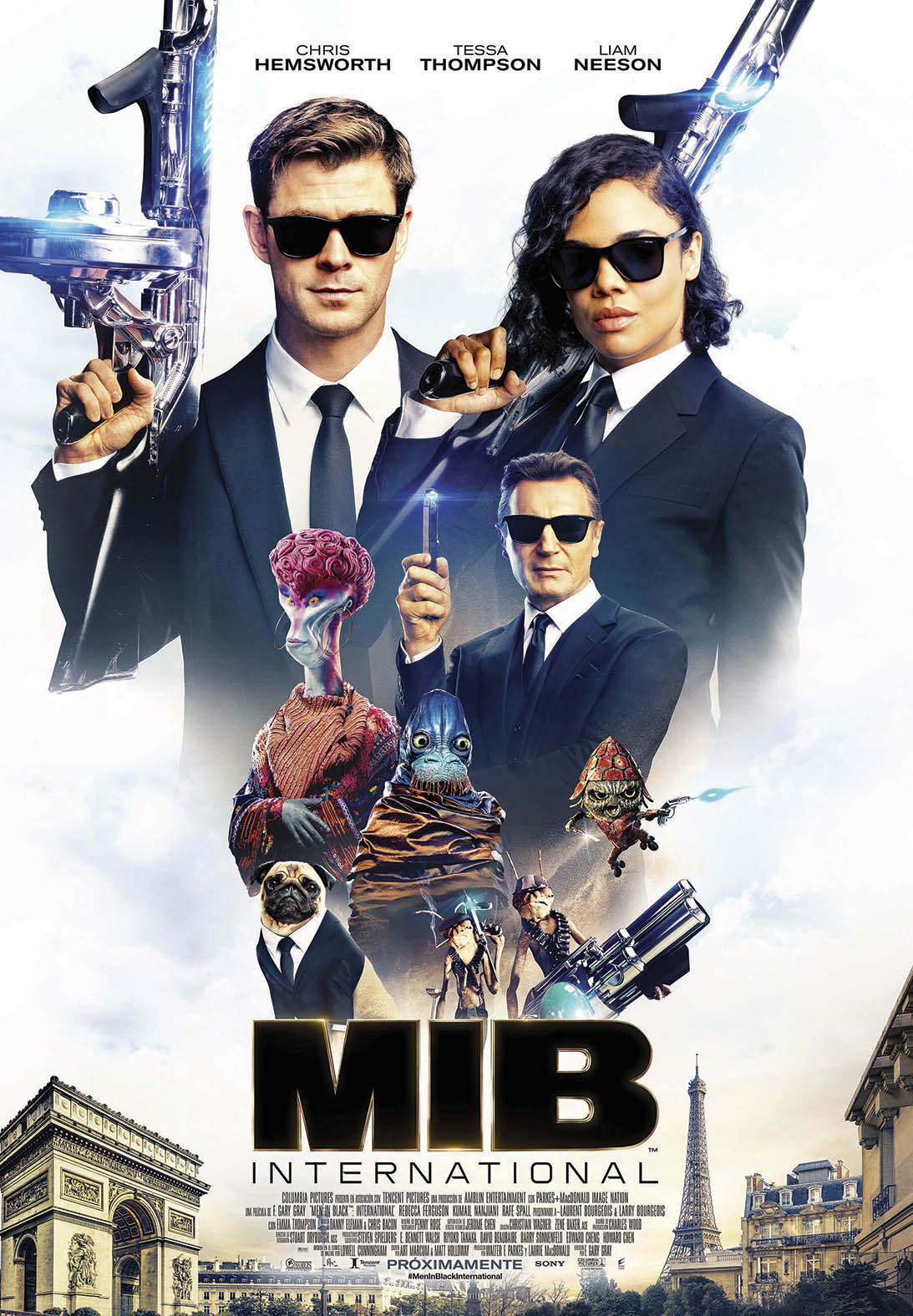 Estreno en España: 14 de junio de 2019. Título original: Men in Black International. Duración: 115 min. País: EE.UU. Dirección: F. Gary Gray. Guion: Art Marcum, Matt Holloway. Música: Chris Bacon, Danny Elfman. Fotografía: Stuart Dryburg. Reparto principal: Chris Hemsworth, Tessa Thompson, Rebeca Ferguson, Kumail Nanjiani, Rafe Spall, Laurent Bourgeois, Emma Thompson, Liam Nesson. Producción: Columbia Pictures, Sony Pictures, Amblin Entertainment, Original Film, Parkes+MacDonald Image Nation, The Hideaway Entertainment, Tencent Pictures. Distribución: Sony Pictures. Género: ciencia ficción, comedia. Web oficial: https://www.meninblack.com/