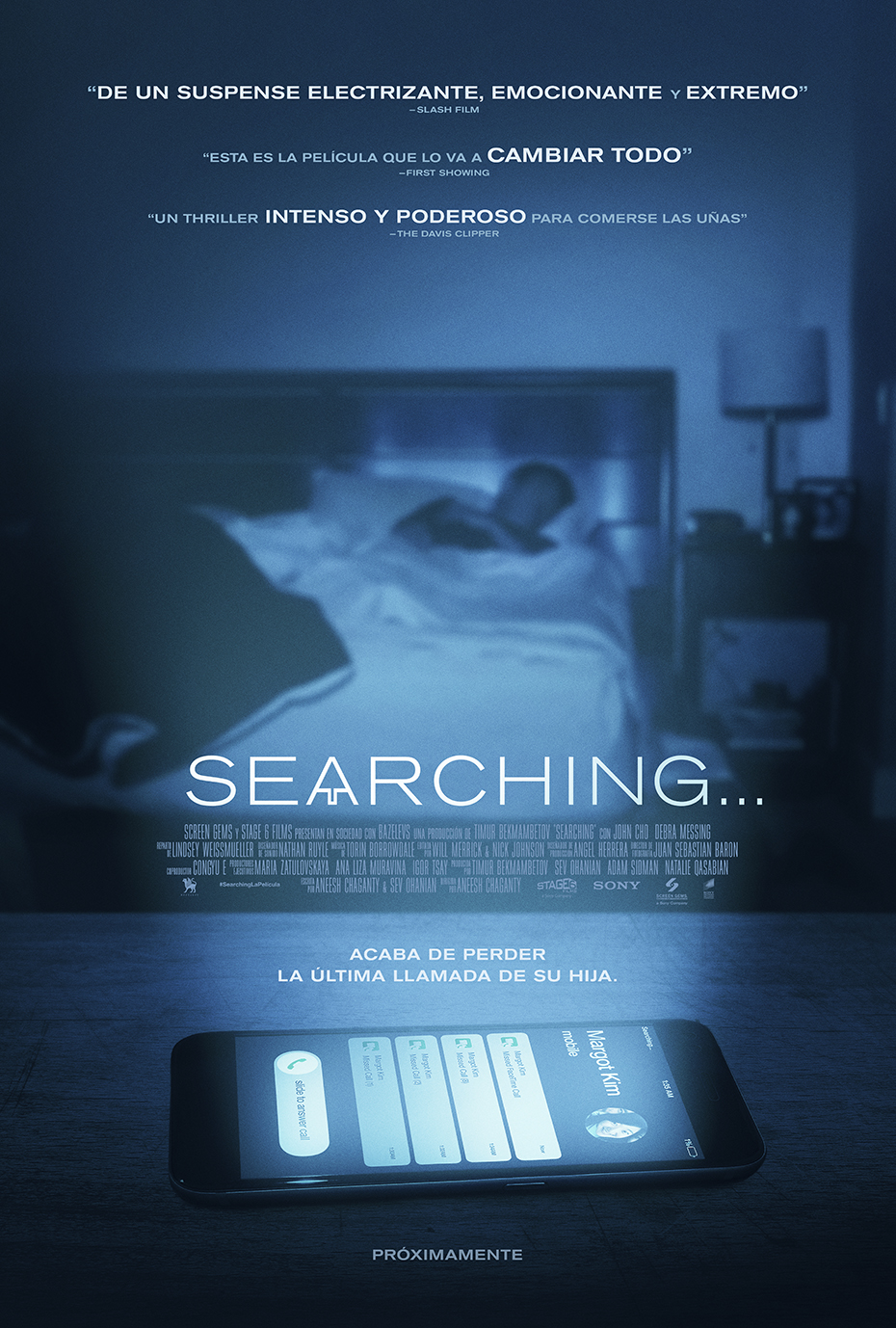 Estreno en España: 28 de septiembre 2018. Título original: Searching. Duración: 101 min. País: Estados Unidos. Dirección: Aneesh Chaganty. Guión: Aneesh Chaganty, Sev Ohanian. Música: Torin Borrowdale. Fotografía: Juan Sebastian Baron. Reparto principal: John Cho, Debra Messing, Joseph Lee, Michelle Le, Sara Sohn. Producción: Stage 6 Films, Bazelevs Entertainment. Distribución: Sony Pictures. Género: Thriller. Web oficial:http://www.searching.movie/site/