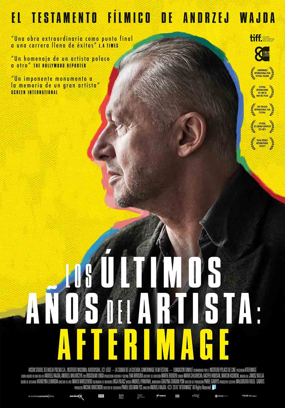 Estreno en España: 30 de junio de 2017. Título original: Powidoki (Afterimage). Duración: 98 min. País: Polonia. Dirección: Andrzej Wajda. Guión: Andrzej Wajda. Música: Andrzej Panufnik. Fotografía: Pawel Edelman. Reparto principal: Boguslaw Linda, Aleksandra Justa, Bronislawa Zamachowska, Szymon Bobrowski, Mariusz Bonaszewski, Tomasz Chodorowski, Izabela Dabrowska, Aleksander Fabisiak, Paulina Galazka, Filip Gurlacz. Producción: Akson Studio, TVP – Telewizja Polska, Instituto Audiovisual Nacional (NINA), PISF, Tumult Foundation. Distribución: Sherlock Films. Género: drama, hechos reales. Web oficial: http://www.sherlockfilms.com/pelicula/530/los-ultimos-anos-del-artista-afterimage/