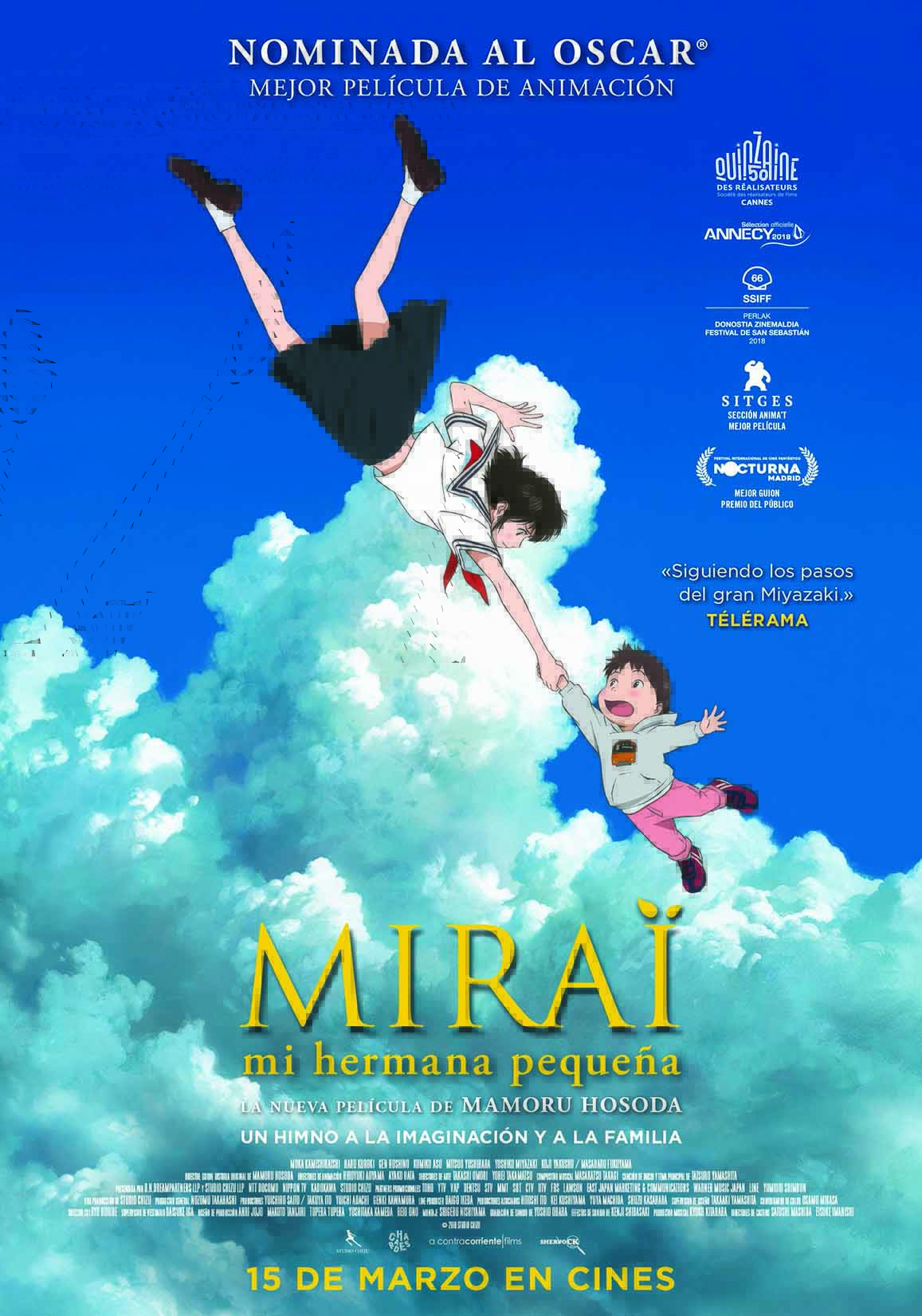 Estreno en España: 15 de marzo de 2019. Título original: Mirai. Duración: 100 min. País: Japón. Dirección: Mamoru Hosoda. Guión: Mamoru Hosoda. Música: Takagi Masakatsu. Reparto principal: Moka Kamishiraishi, Haru Koroki, Gen Hoshino, Kumiko Aso, Mitsuo Yoshihara, Yoshiko Miyazaki Koji Yakusho. Producción: Studio Chizu. Distribución: Sherlock Films, AContracorriente Films. Género: Web oficial: http://mirai-no-mirai.jp/