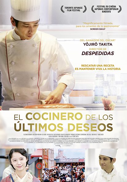 Estreno en España: 23 de agosto. Título original: The last recipe: Kirin no shita no kioku. Duración: 126 min. País: Japón. Dirección: Yôjirô Takita Guión: Tamio Hayashi, basado en la novela de Keiichi Tanaka. Fotografía: Yoshinori Oshima. Reparto principal: Kazunari Ninomiya, Hidetoshi Nishijima, Aoi Miyazaki, Gô Ayano, Daigo Nishihata, Yoshi Oida, Togo Igawa. Producción: Pipeline. Distribución: Sherlock Films y A Contracorriente Films. Género: Drama. Web oficial: http://www.sherlockfilms.com/pelicula/543/el-cocinero-de-los-ultimos-deseos/