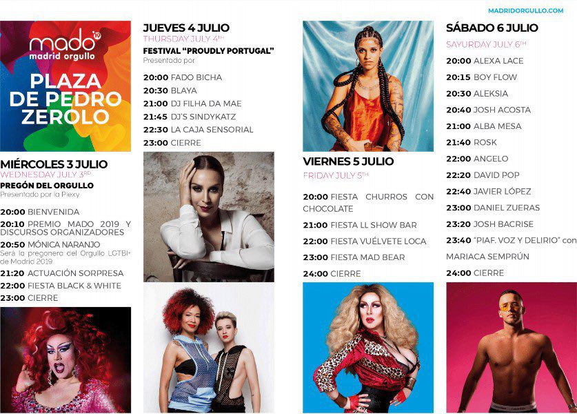 El miércoles 3 de julio la Plaza de Pedro Zerolo acogerá a la artista Mónica Naranjo, presente en la rueda de prensa, encargada del tradicional pregón, que abrirá los días grandes de estas fiestas. La celebración y reivindicación se materializarán el sábado 6 de julio, fecha de la Manifestación estatal del Orgullo, con el mismo recorrido que el año pasado, saldrá desde Atocha hasta la plaza de Colón, bajo el lema “Mayores Sin Armarios: ¡Historia, Lucha y Memoria!”. Por una ley LGTBI estatal».