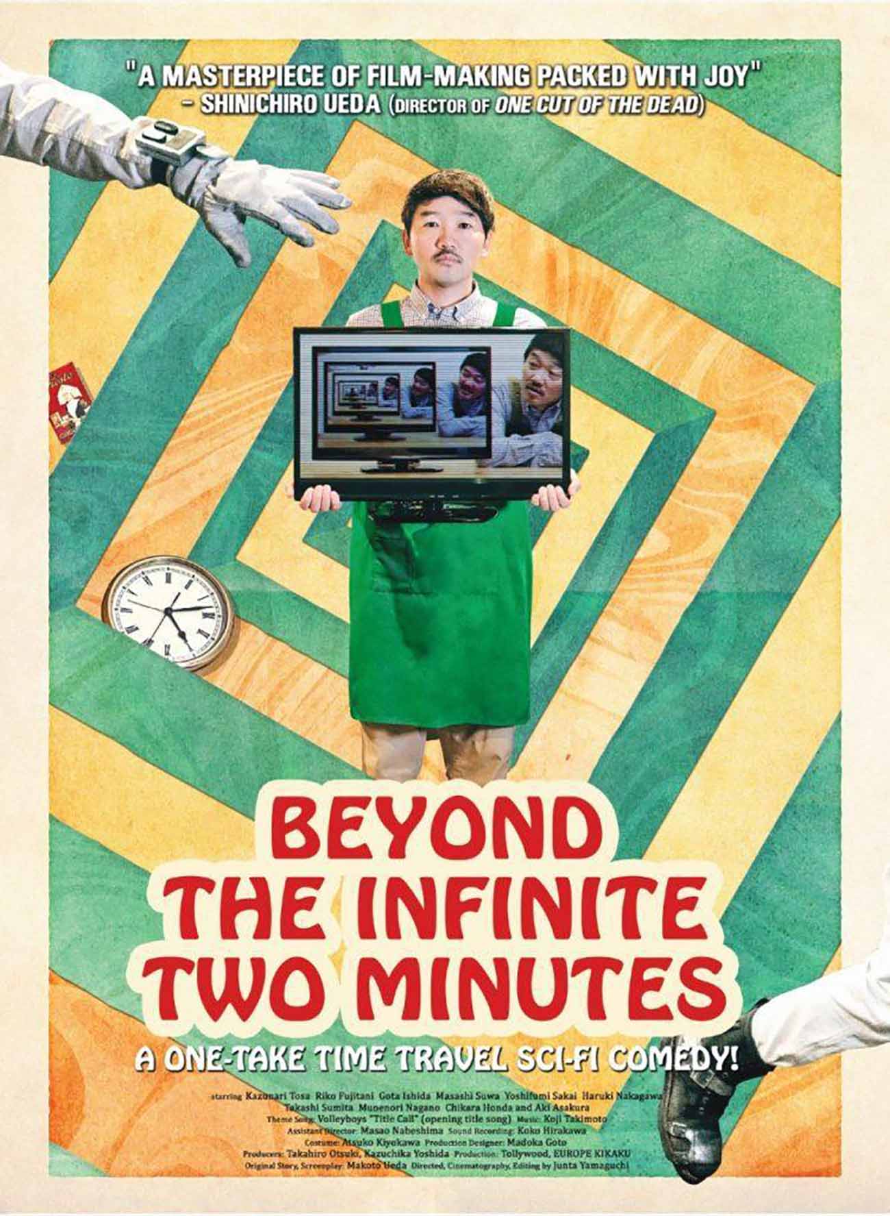 Se une a películas tipo ‘Frequency’, ‘Dejavu’, ‘Los cronocrímenes’ ‘Next’… pero como he comentado con el humor como herramienta. Simpatiquísima película que nos conquista con una duración más que modesta y moderada, una hora y diez minutos que de haberse alargado quizá habría peligrado de caer en errores. Estupendo control del racord y del tiempo fílmico, pero sobre todo de la coreografía. Y es que además para rizar el rizo, emulando a sus compatriotas, también tremendamente ingeniosos de ‘One cut of the dead’, juguetean cámara en mano con planos secuencias. Todo encaja sin que percibamos ni un solo artificio, como una obra de teatro ensayada una y otra y otra vez hasta alcanzar la perseguida cuadratura del círculo. El trabajo de planificación de movimiento de cámara y el de generación de vídeos para las pantallas es tremendo.